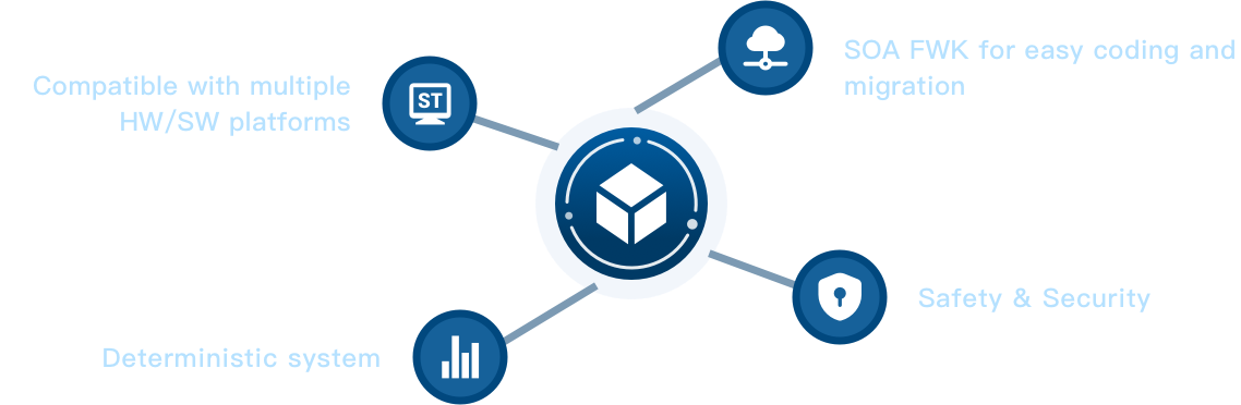 A heterogeneous computing & domain-fusion oriented software platform for intelligent vehicles, designed with robust safety and security. It addresses fragmentation, poor collaboration, and weak security issues in customers' multi-module integration.