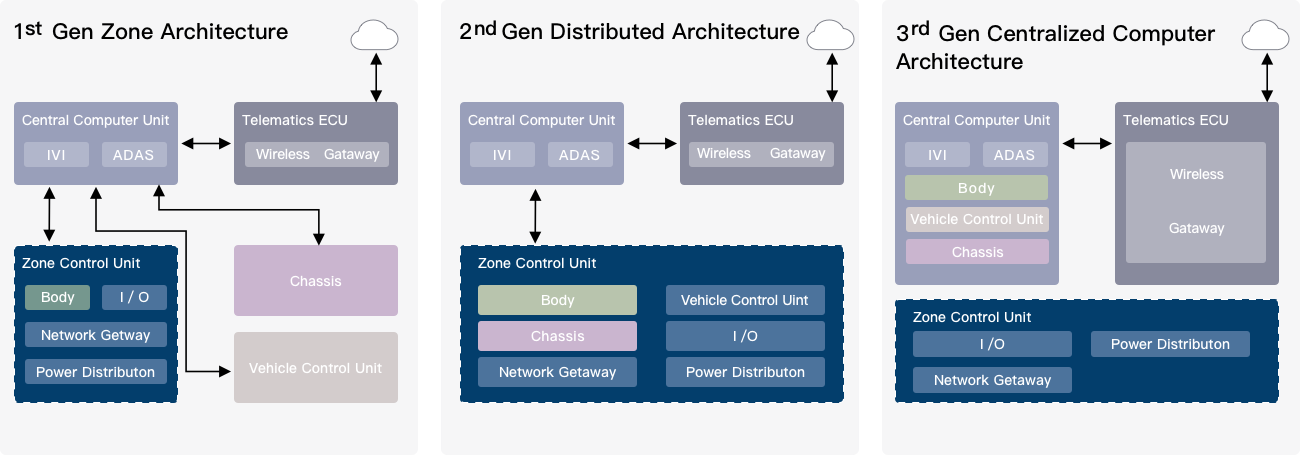 Zone-based design greatly reduces long wiring from vehicle periphery to the central controller, significantly lowering vehicle weight, cost, and assembly complexity.
