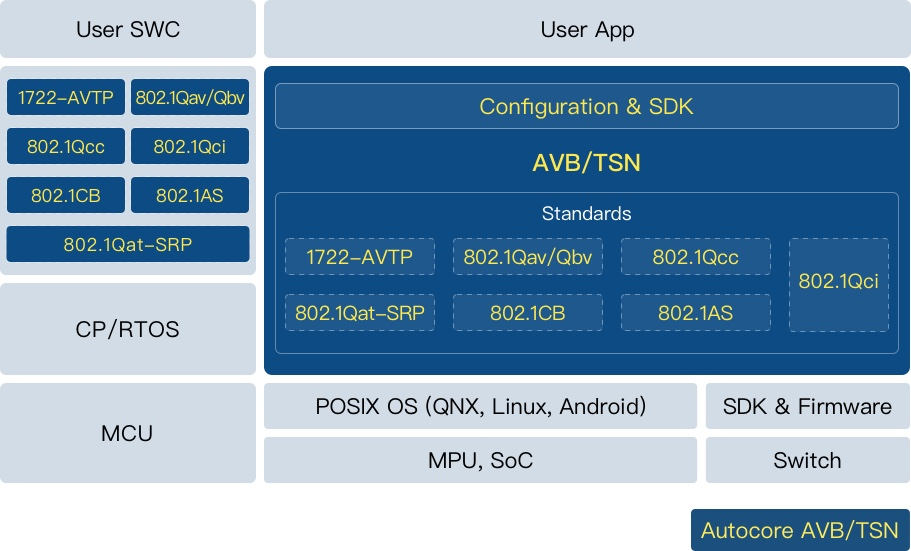 AutoCore TSN软件包具备卓越的可移植性,支持在QNX、Linux、Android、Classic AUTOSAR等多种操作系统上部署。无论是资源受限的MCU嵌入式控制器,还是性能强劲的MPU/SoC高性能计算单元,该软件包均能提供统一的配置接口与SDK,极大简化了异构系统间的网络互联开发。
